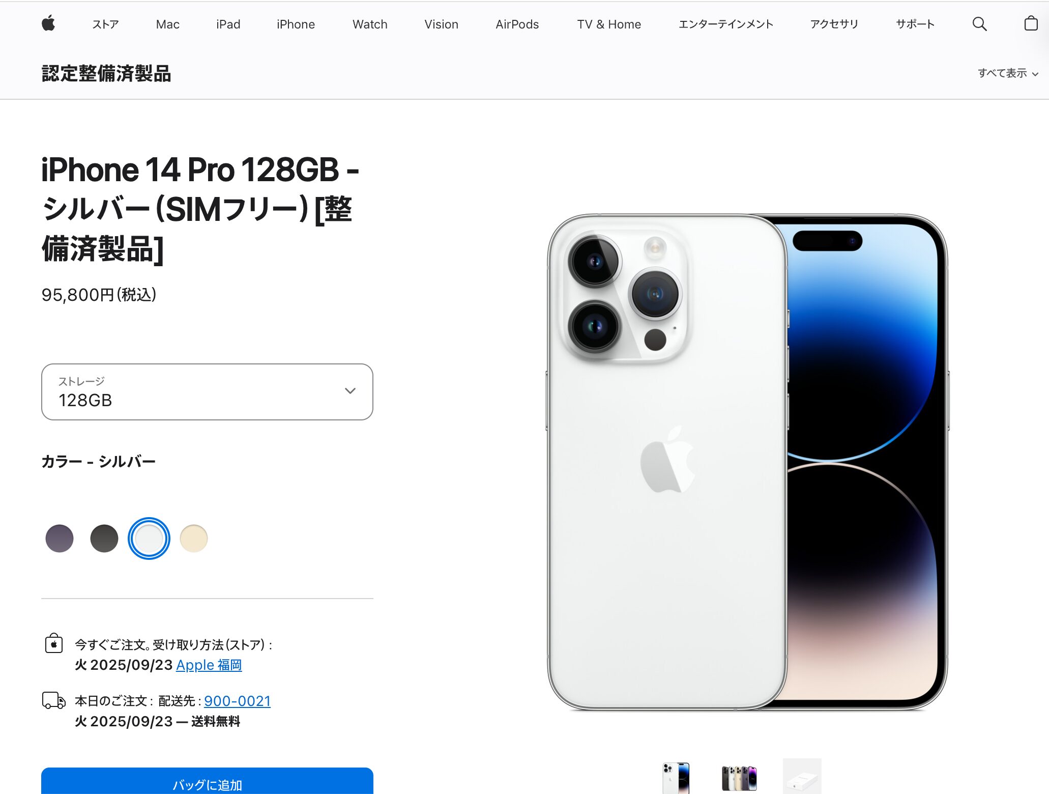 例えば、2025年9月20日時点で、AppleストアにiPhone 14 Pro 128GBモデルの整備済製品が出ているのですが、値段が95,800円(税込)です。(※下はそのスクリーンショット)