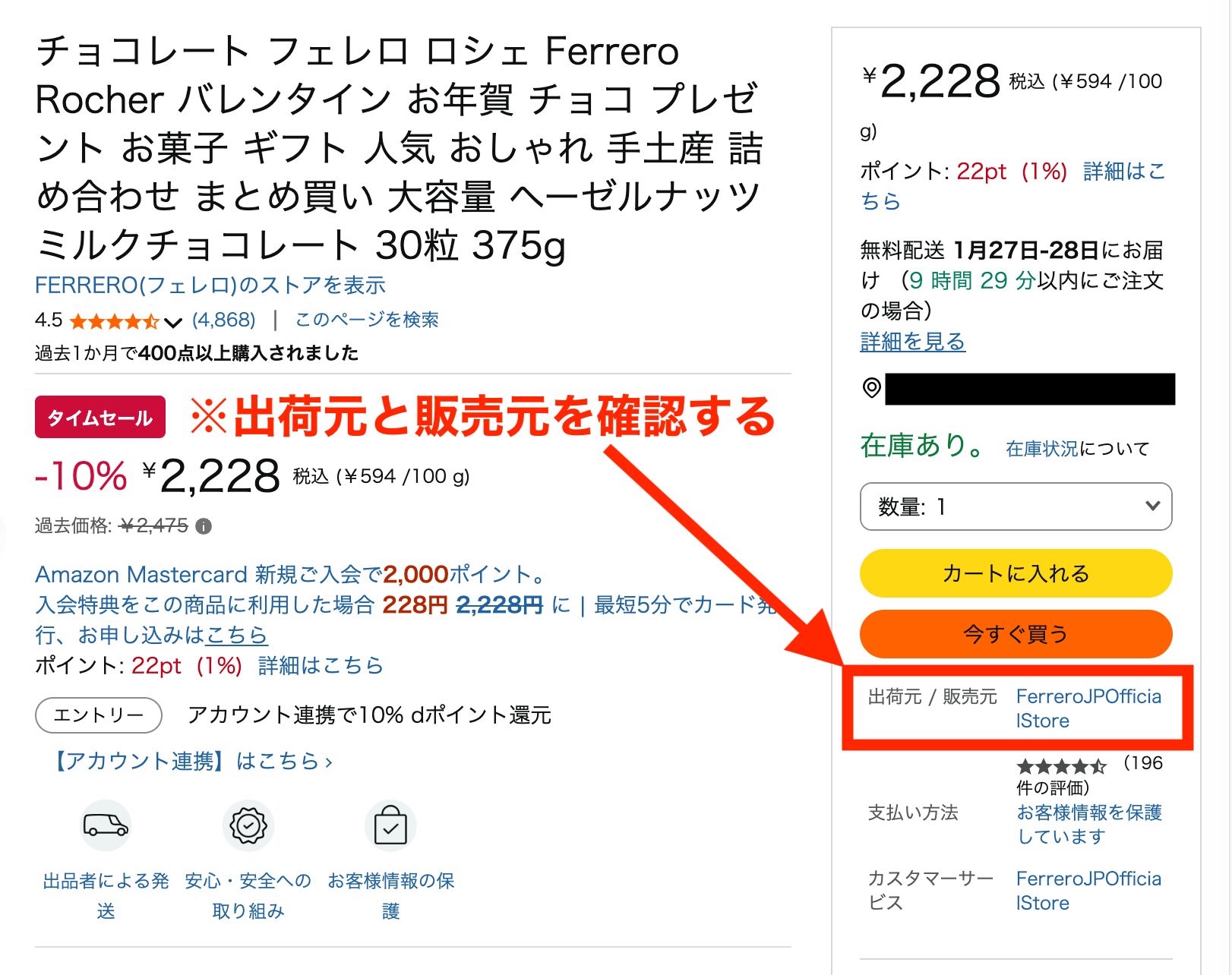 一番確実なのは、出荷元と販売元の両方が「FerreroJPOfficialStore」(またはAmazon.co.jp)と表示されている商品です。