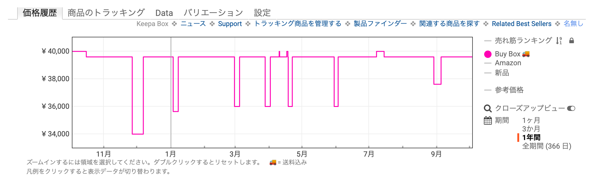 それ以外の時期でも、ほぼ2ヶ月に一度、3万6,000円まで(つまり3,500円の値引き)下がっているのが分かると思います。